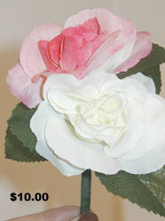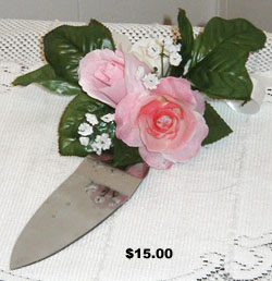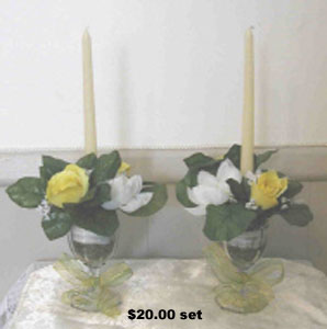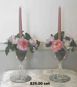 These creations were made with weddings in mind. The candles are made from wine glasses. The set on the left are attached to a mirror base with pearls added for elegance. Centerpieces can be made to match as well as boutonnieres, bridal bouquets, cake knives, etc.